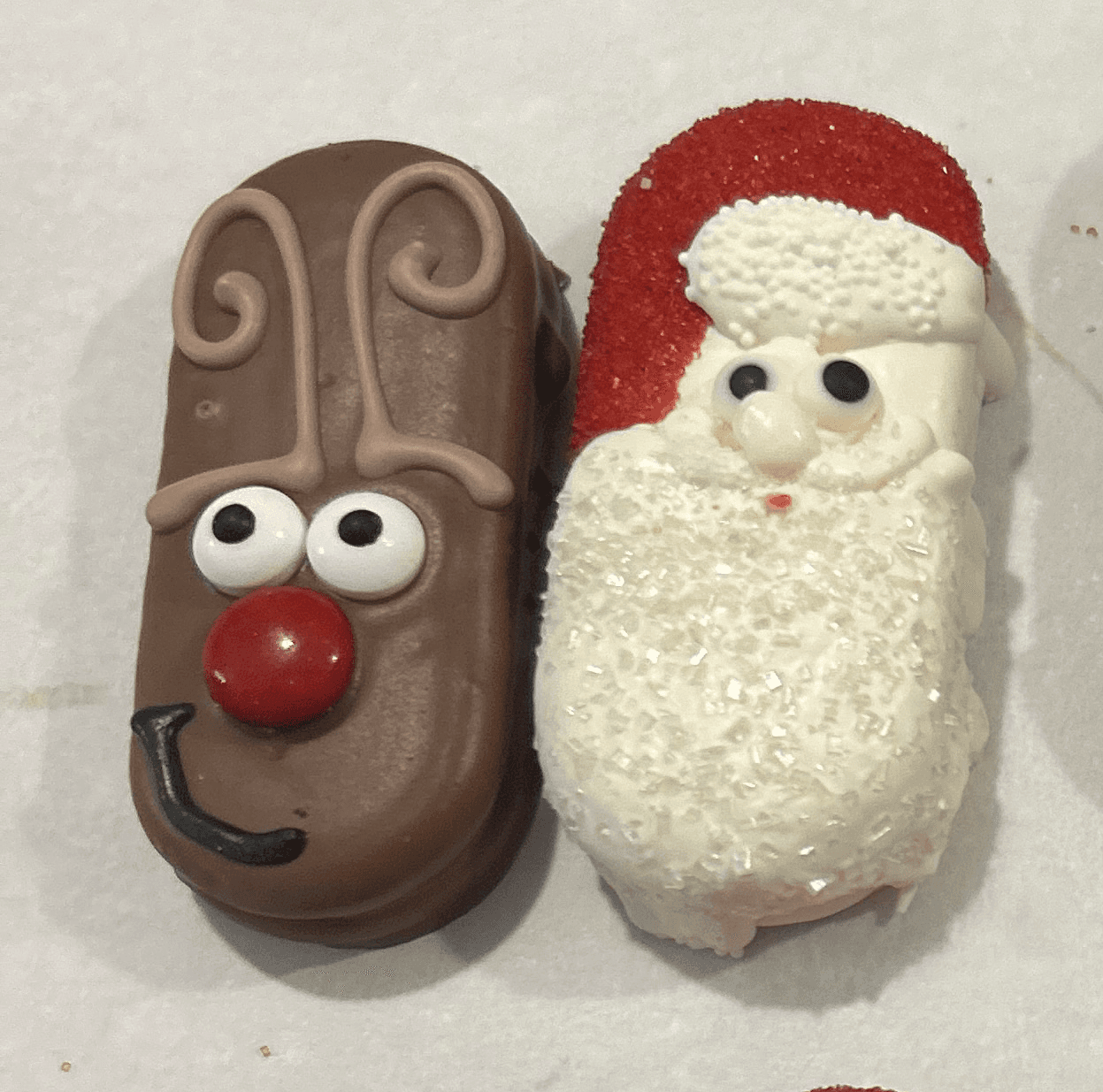 Two holiday icons, one delicious duo! Our Deer Santa Vienna Finger set features one cookie dressed as jolly Santa himself and the other as his favorite four-legged flyer, Rudolph. Each cookie is hand-dipped and decorated with sweet details—Rudolph’s bright red nose and antlers, Santa’s classic red hat and white beard—all wrapped around that familiar crunchy peanut-butter cookie goodness.