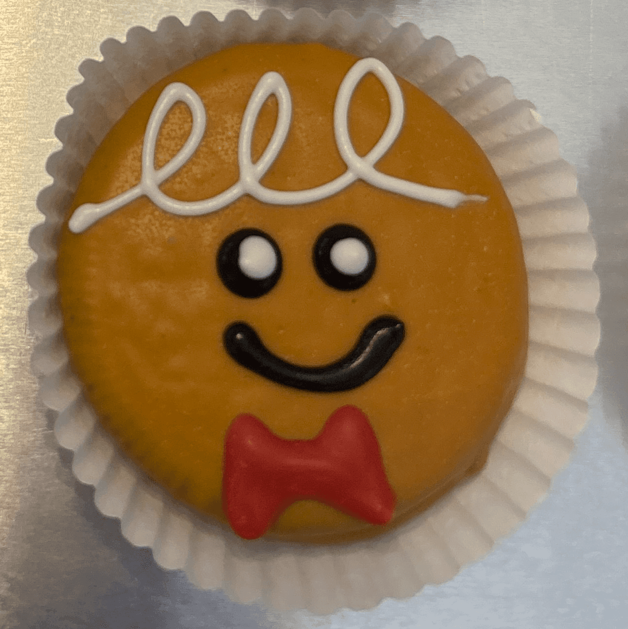 Meet the sweetest little cookie in our holiday lineup! This hand-dipped Oreo is dressed up as an adorable gingerbread friend—complete with a silky caramel-colored coating, bright white icing curls, big cheerful eyes, and a festive red bow tie.