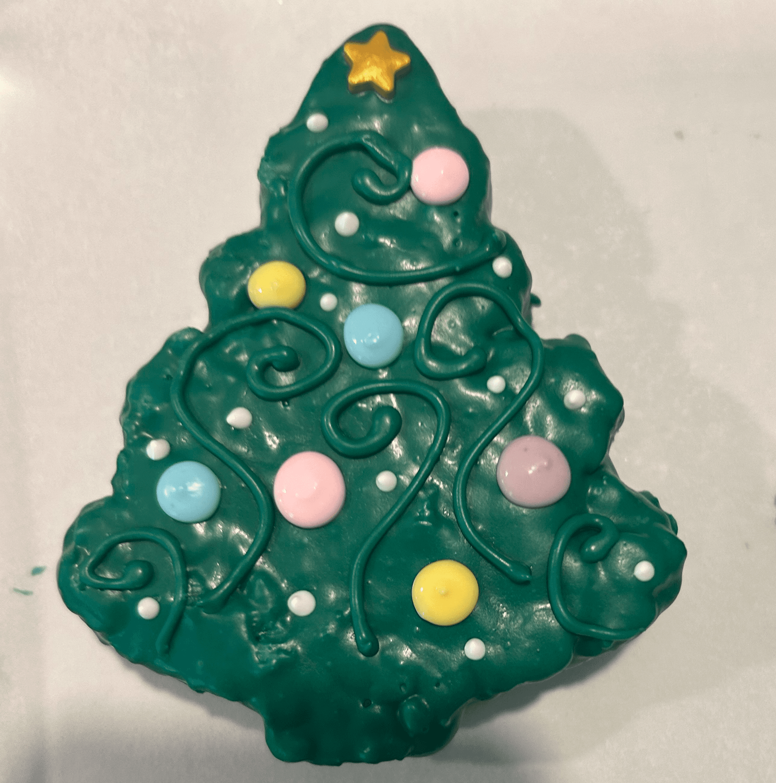 This Holiday Krispie Tree is decked out and ready to shine! This crunchy–chewy classic is hand-dipped in rich green chocolate, then decorated with swirled “garland,” pastel ornaments, and a tiny golden star on top. It’s festive, fun, and almost too cute to eat… almost. Perfect for stocking stuffers, classroom treats, holiday parties, or a sweet little pick-me-up while you wrap gifts.